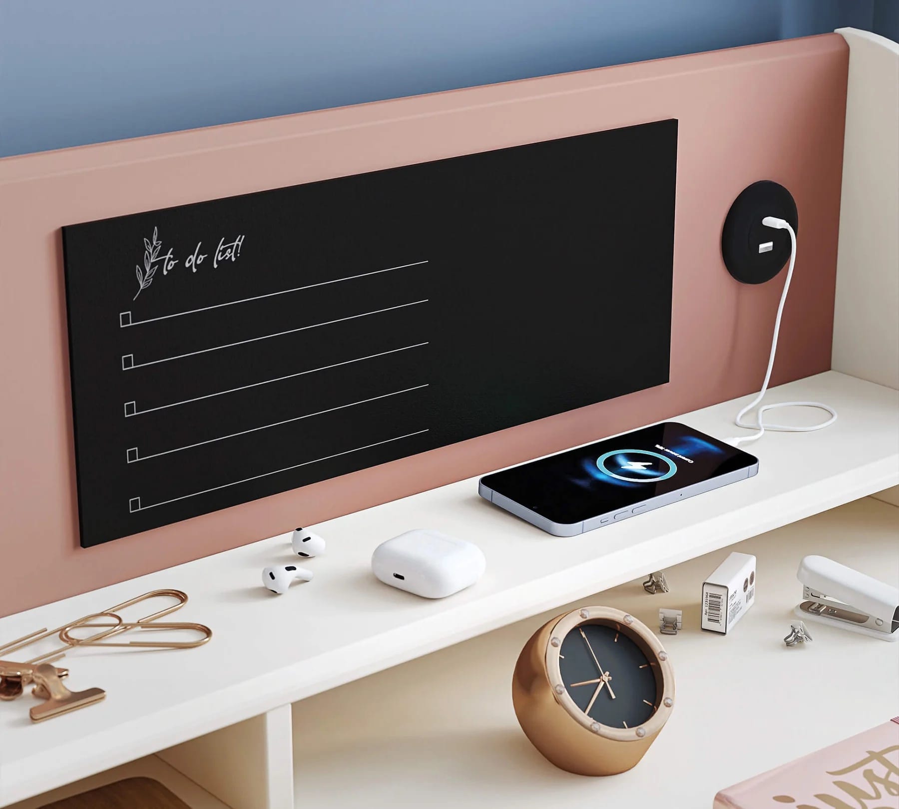 Funcționalitate si compartimentare✔ 3 sertare frontale încăpătoare Sertare integrate pe toată lungimea frontului Glisiere metalice pentru o deschidere lină Interior finisat în ton cu exteriorul (premium look) ✔ Organizator intern complet compartimentat Ideal pentru: instrumente de scris, markere, pensule accesorii creative, palete, rigle, pixuri cosmetice sau obiecte personale ✔ Blat de lucru mare și stabil Suprafață extinsă pentru laptop, cărți, suporturi și lampă Finisaj mat, plăcut la atingere Colțuri ergonomice ✔ Etajeră superioară Suport pentru telefon & tabletă Mini-tablă neagră pentru notițe Organizatoare speciale pentru stilouri Raft pe toată lungimea pentru depozitare rapidă