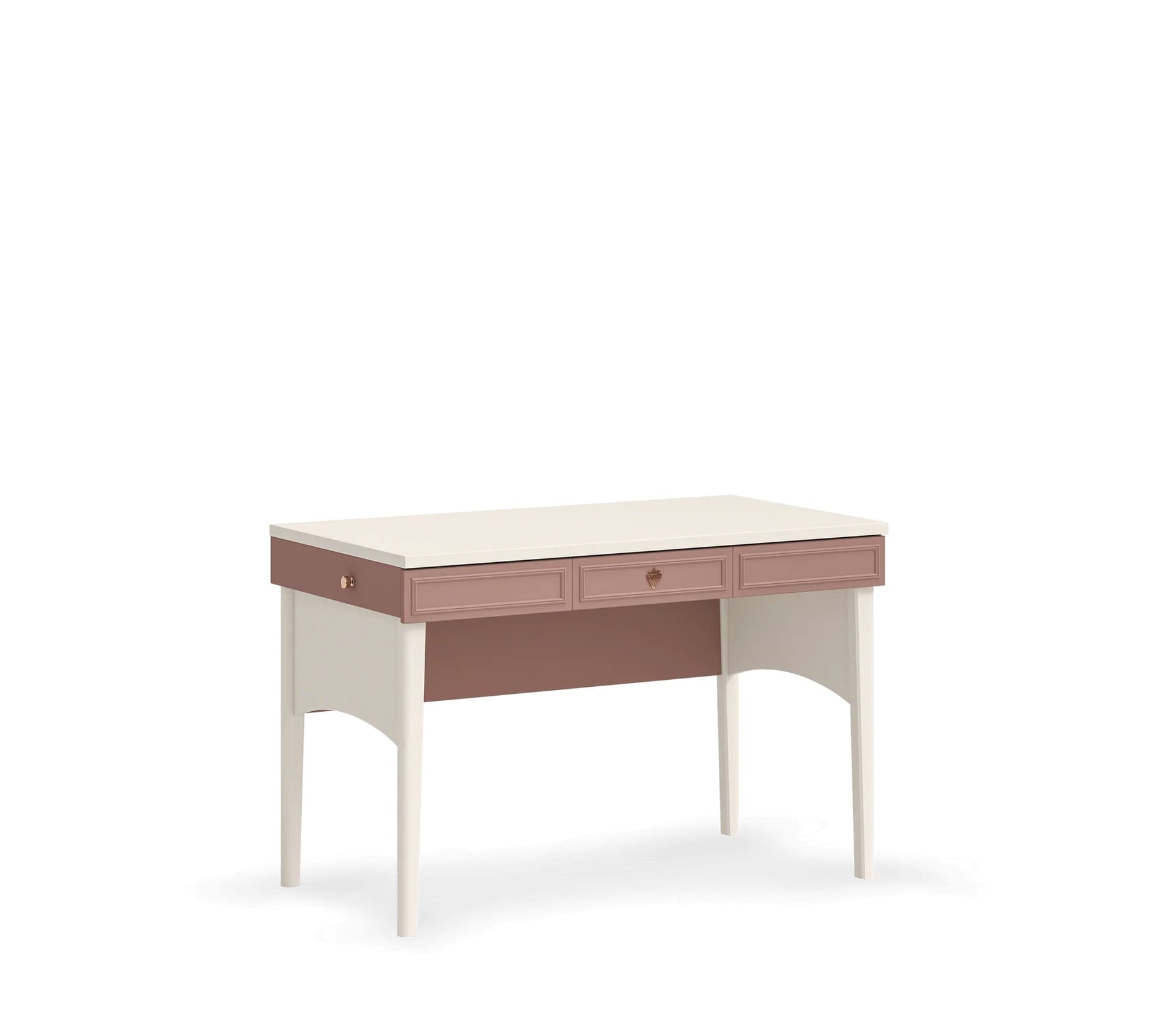 Birou 117 cm, 3 sertare cu organizator și etajeră, stil modern romantic, alb mat și roz pudră, accente rose-gold, design premium pentru studiu și make-up PEARL