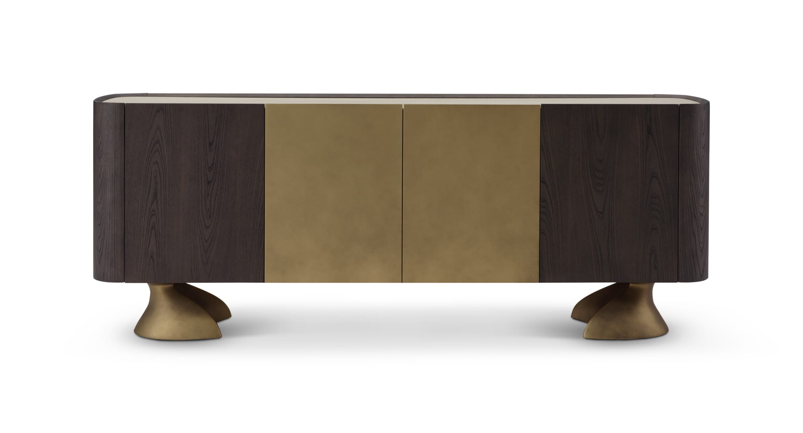 Blatul superior din ceramică albă italiană adaugă luminozitate și contrast, fiind completat de corpul placat cu furnir de ulm în nuanță gri închis mat. Ușile centrale, cu finisaj uniform și accent subtil, sunt susținute de picioare sculpturale din fiberglass finisate în brass vintage, care conferă piesei un caracter distinct și o notă elegantă de rafinament.