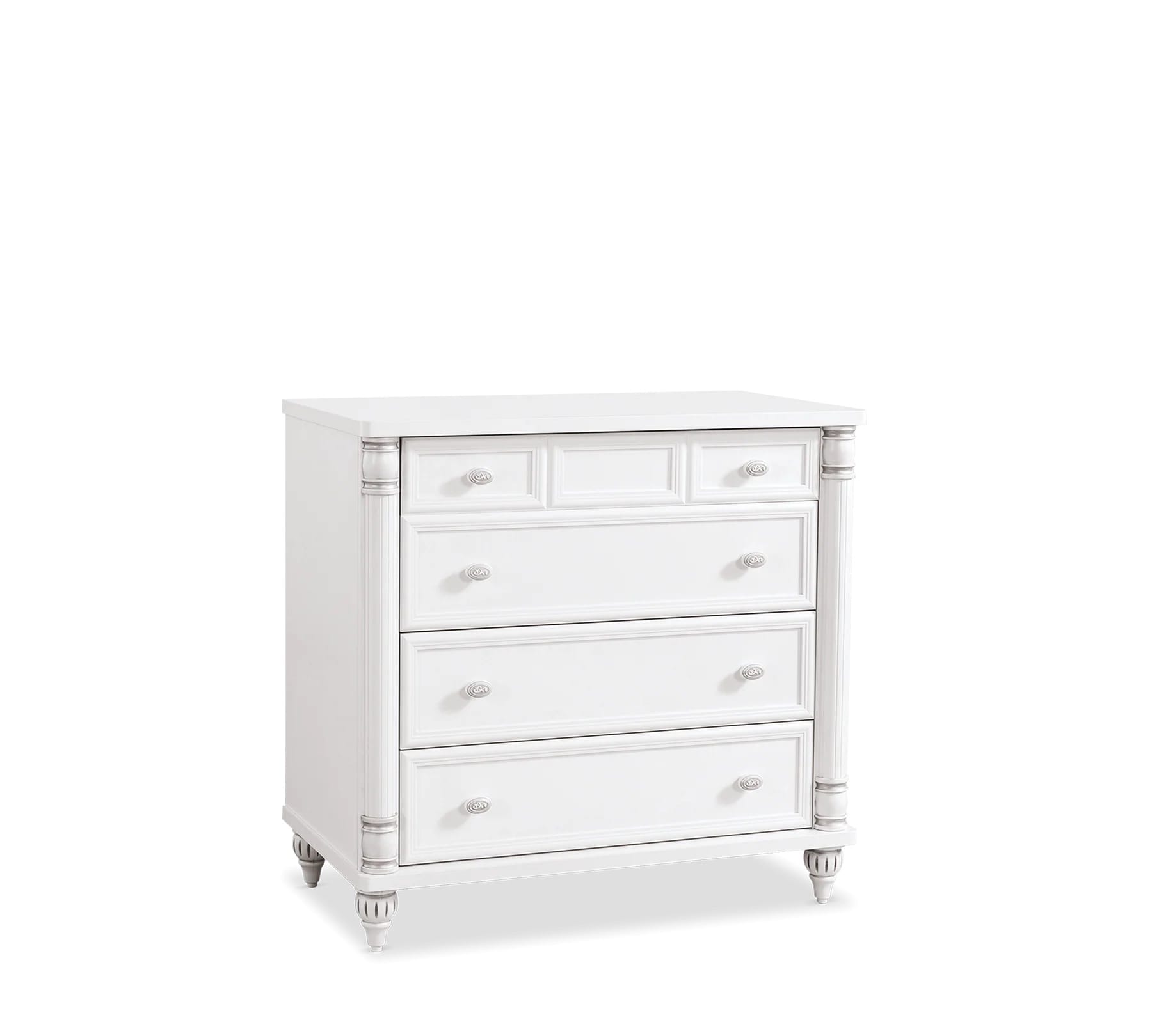 Funcționalitate si compartimentare4 sertare încăpătoare 2 sertare mici superioare pentru accesorii, bijuterii, articole personale 2 sertare mari pentru haine, textile, lenjerii sau organizare voluminoasă Glisiere metalice pentru o deschidere lină și silențioasă Mânere decorative rotunjite cu motiv romantic ✔ Blat superior generos Ideal pentru accesorii, decoruri, parfumuri sau organizatoare Rezistent la zgârieturi și ușor de curățat