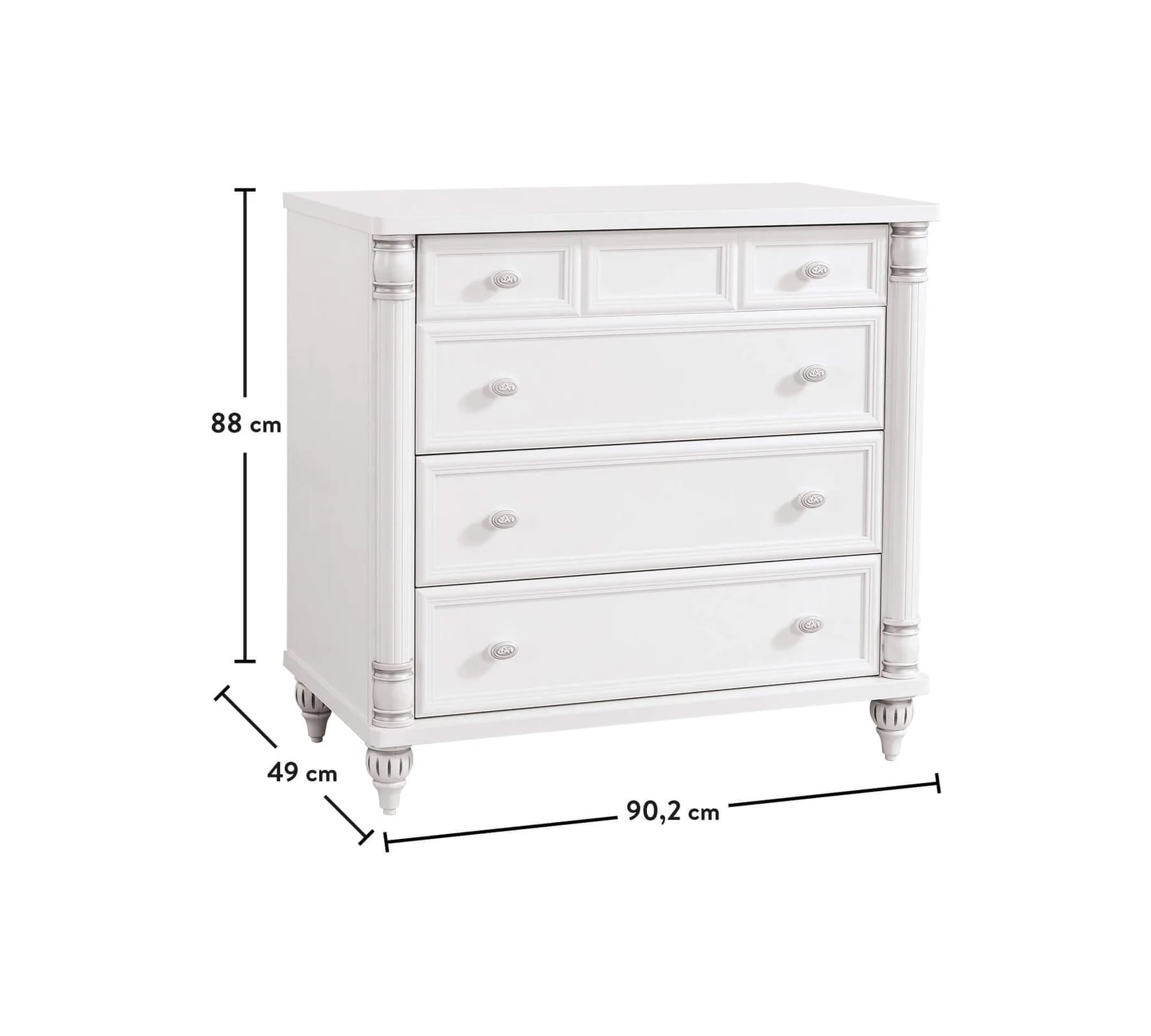 Comodă 90 cm, 4 sertare spațioase, stil clasic romantic vintage, alb antique cu accente argintii, design elegant cu detalii sculptate AMELIE