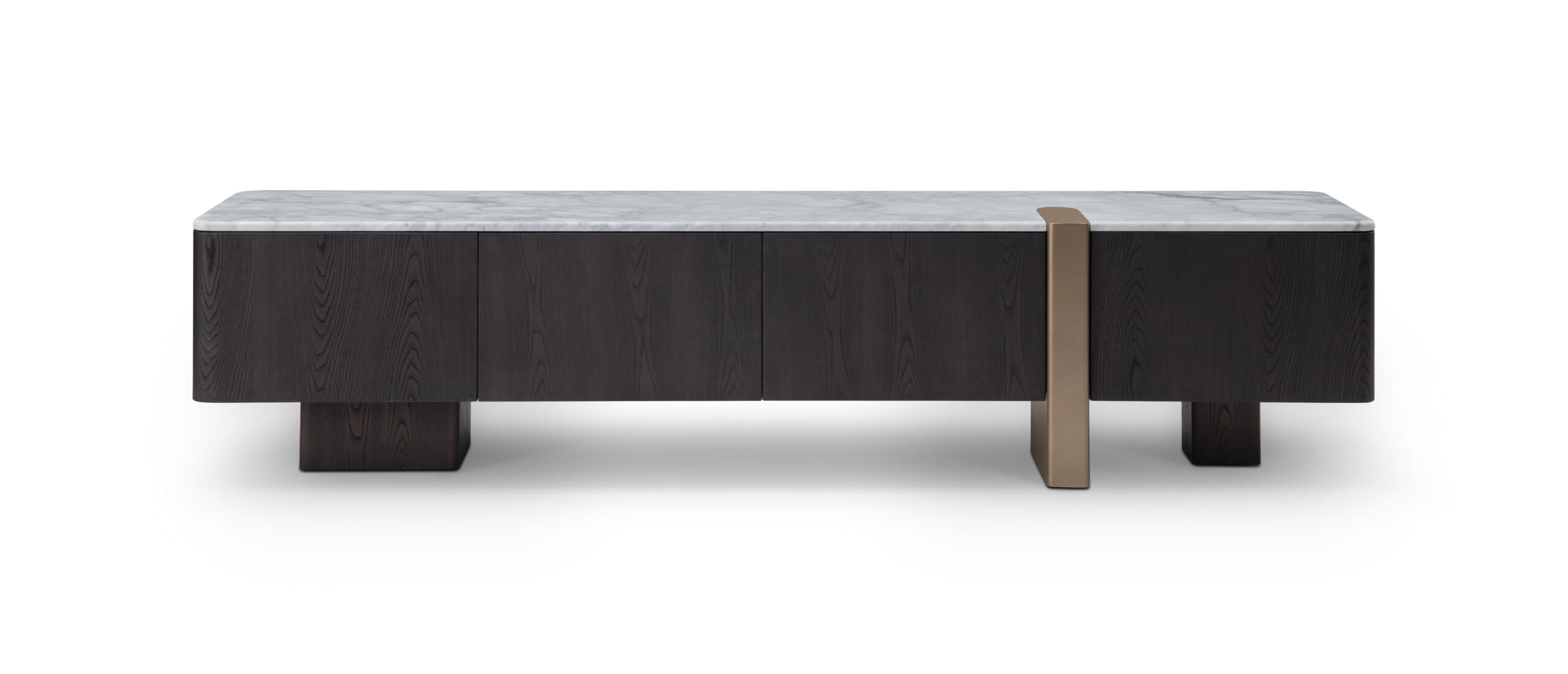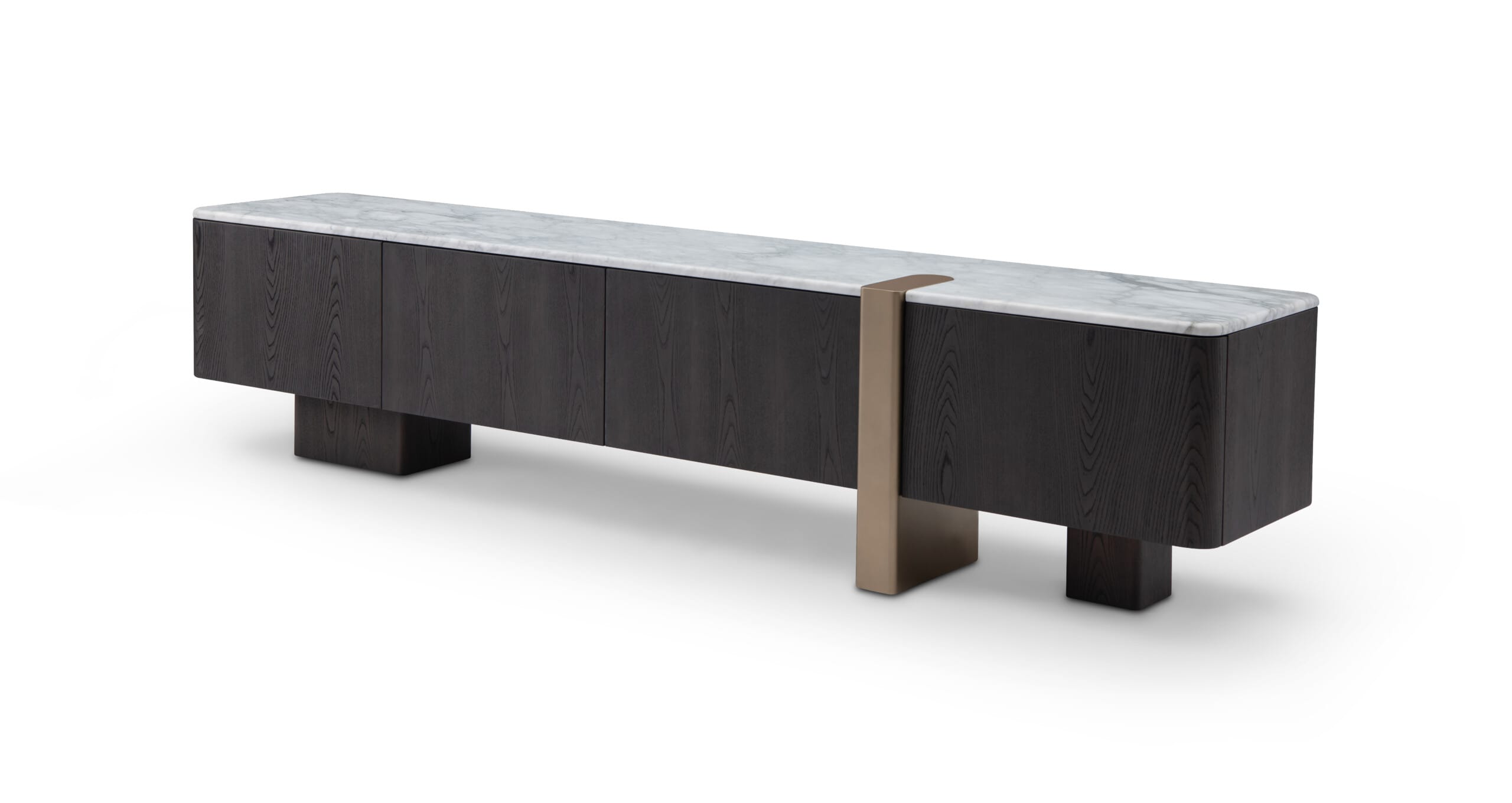 Blatul din marmură albă, cu finisaj mat, adaugă o notă rafinată și luminoasă, completând armonios masa vizuală a comodei. Elementul vertical decorativ, finisat în ton de alamă, creează un accent arhitectural distinct, rupând simetria într-un mod controlat și elegant.