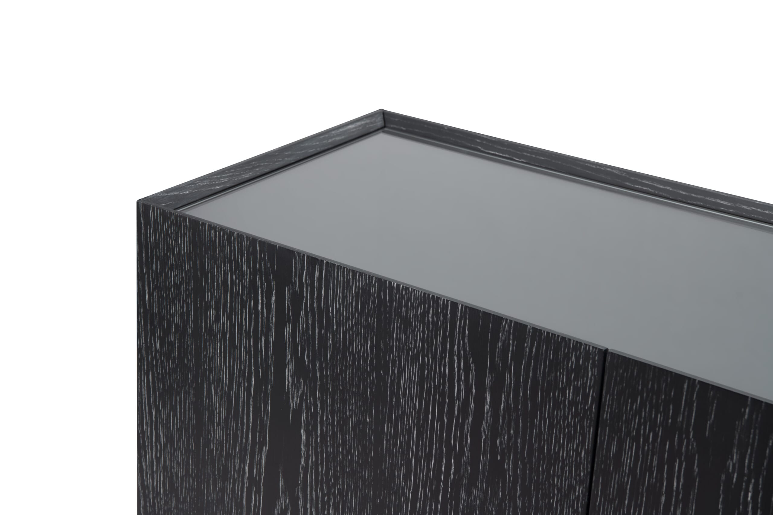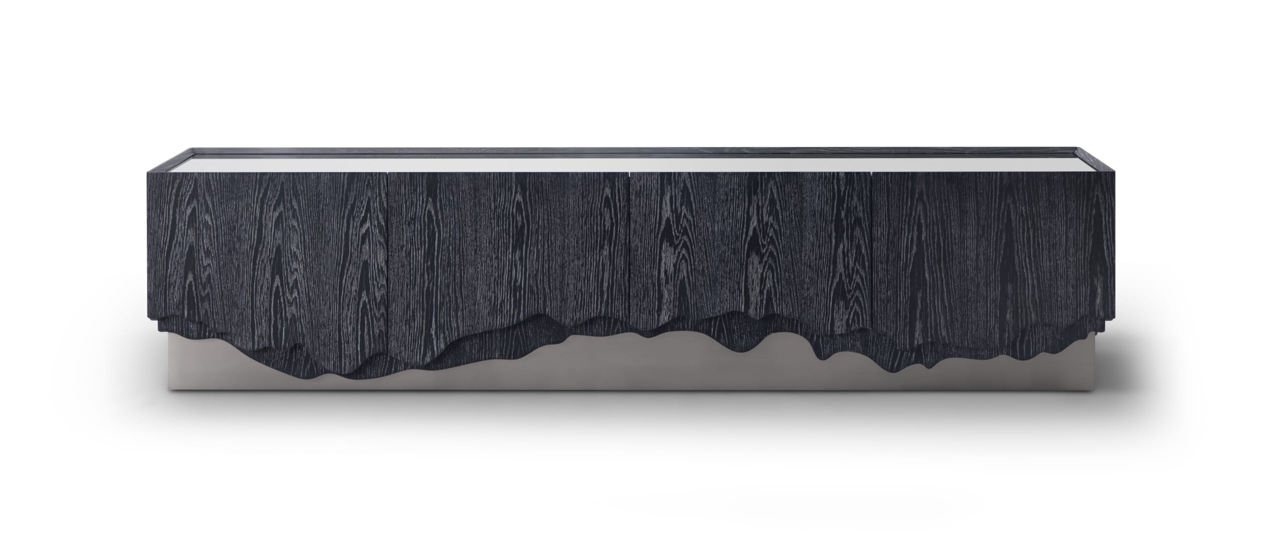 Comoda Aurora Noir impresionează prin designul său sculptural și echilibrul rafinat dintre materiale contrastante. Corpul este placat cu furnir de stejar negru, într-un finisaj cu profunzime vizuală, accentuat de fronturile cu textură organică, care creează un joc subtil de umbre și volume. Linia decorativă neregulată adaugă caracter și transformă piesa într-un element central al spațiului.