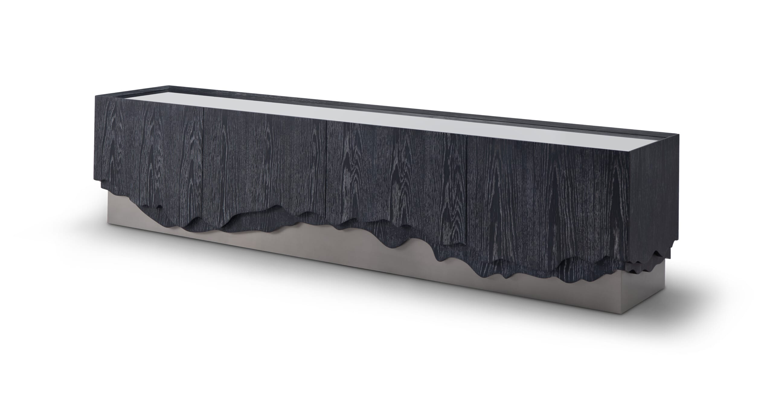Comodă TV 220 cm, furnir stejar negru, blat oglindă gri, bază oțel inoxidabil AURORA NOIR, design sculptural pentru interior sofisticat