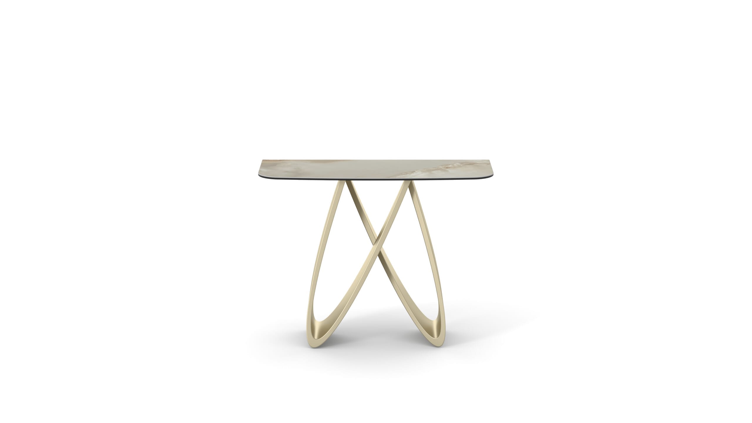 Consolă 100 cm, blat ceramic cu efect marmură și sticlă securizată, bază metalică sculpturală aurie FIRENZE, design modern luxury pentru interior elegant