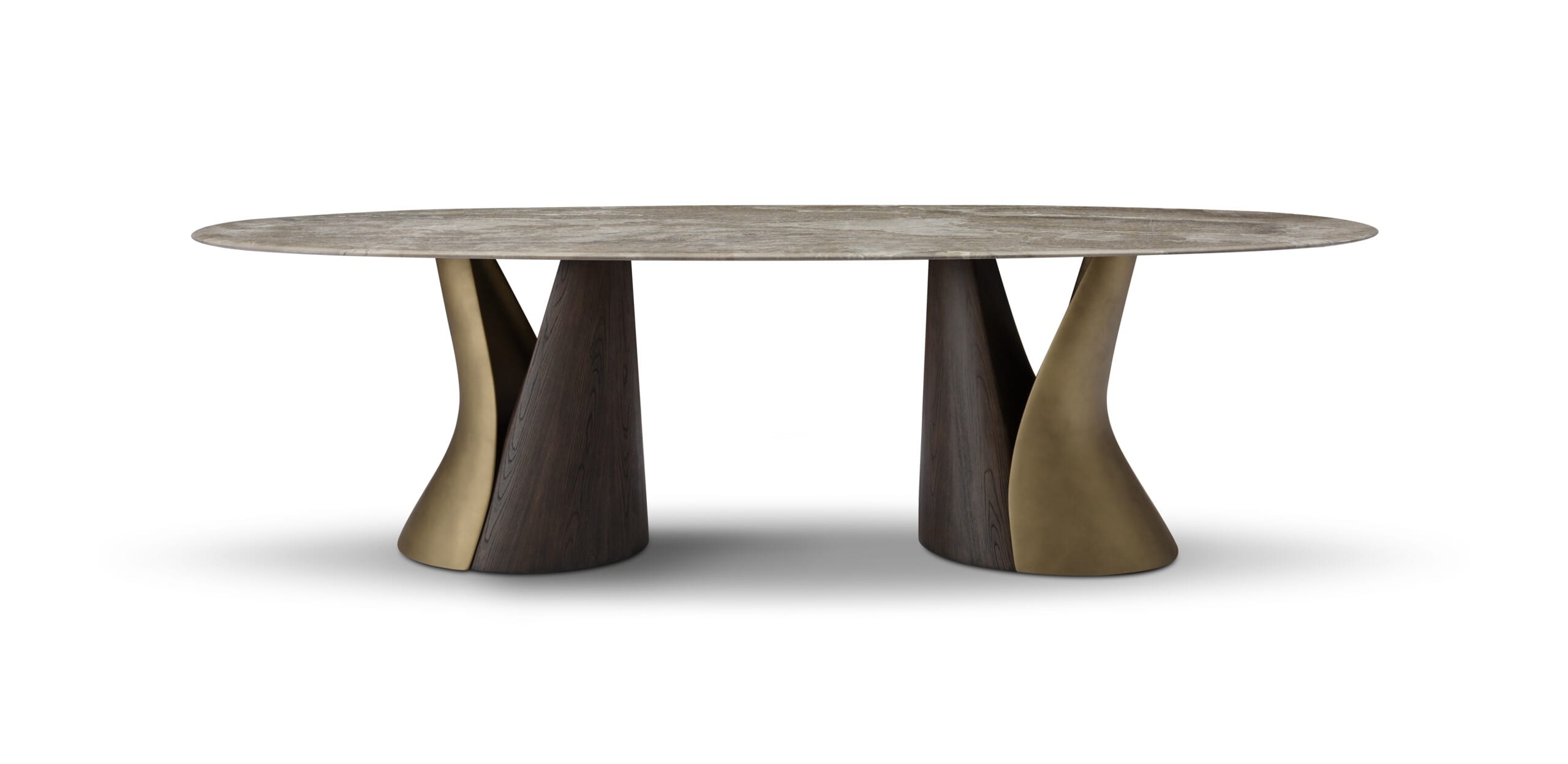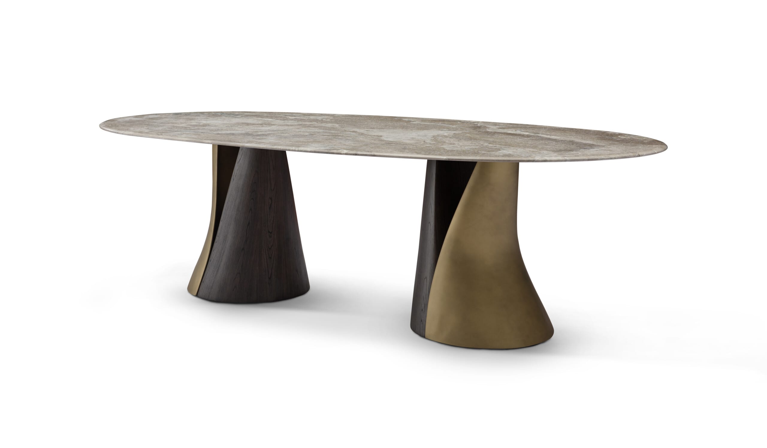 Masa de dining Dualis long reprezintă o interpretare amplificată a conceptului Dualis, punând accent pe proporții generoase și un dialog rafinat între materiale contrastante. Blatul alungit din marmură naturală creează o prezență elegantă și impunătoare, fiind susținut de trei picioare cu expresii vizuale distincte, care conferă stabilitate și dinamism compoziției.