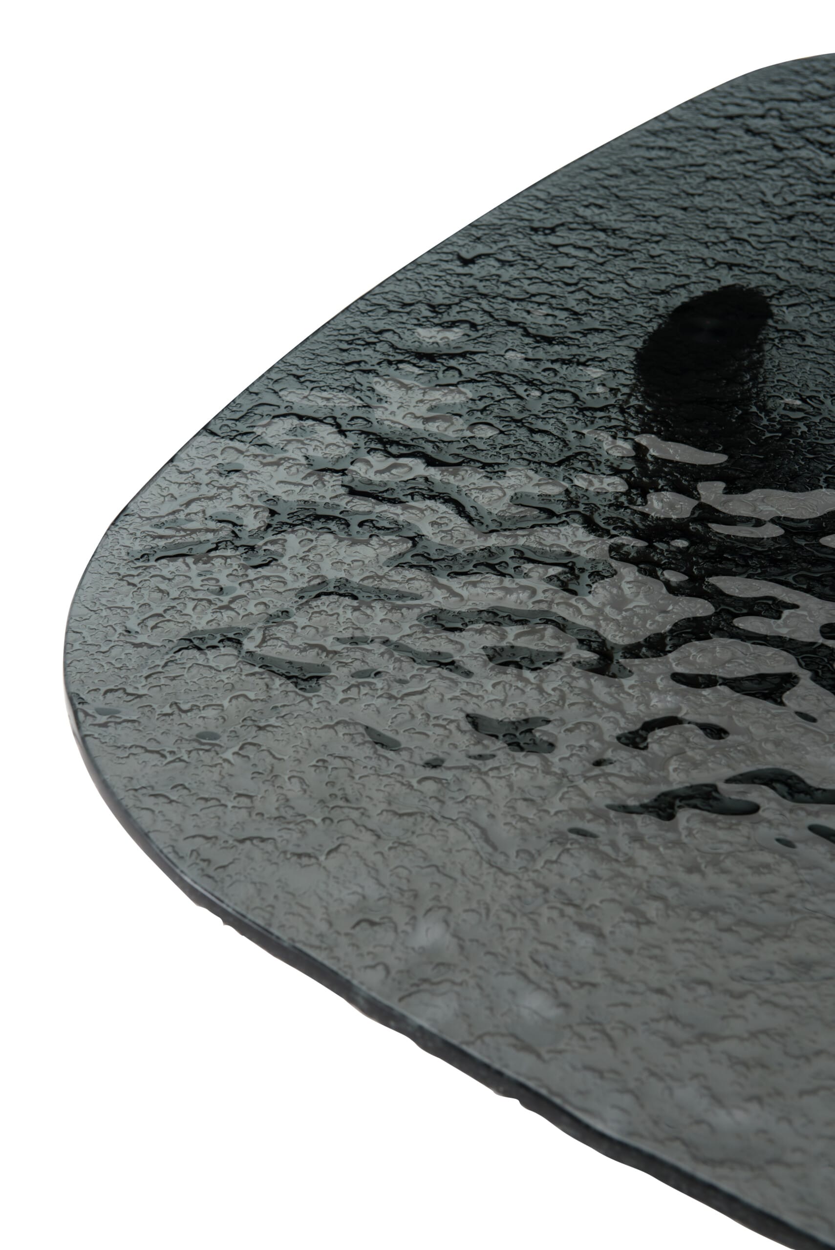 Blatul din sticlă fumurie, cu efect artistic „watery art”, creează un joc subtil de transparențe și reflexii, adăugând profunzime și caracter. Structura din lemn masiv de ulm, finisată într-o nuanță închisă, este completată de elemente metalice cu finisaj negru mat, care leagă armonios componentele și subliniază liniile curate ale designului.