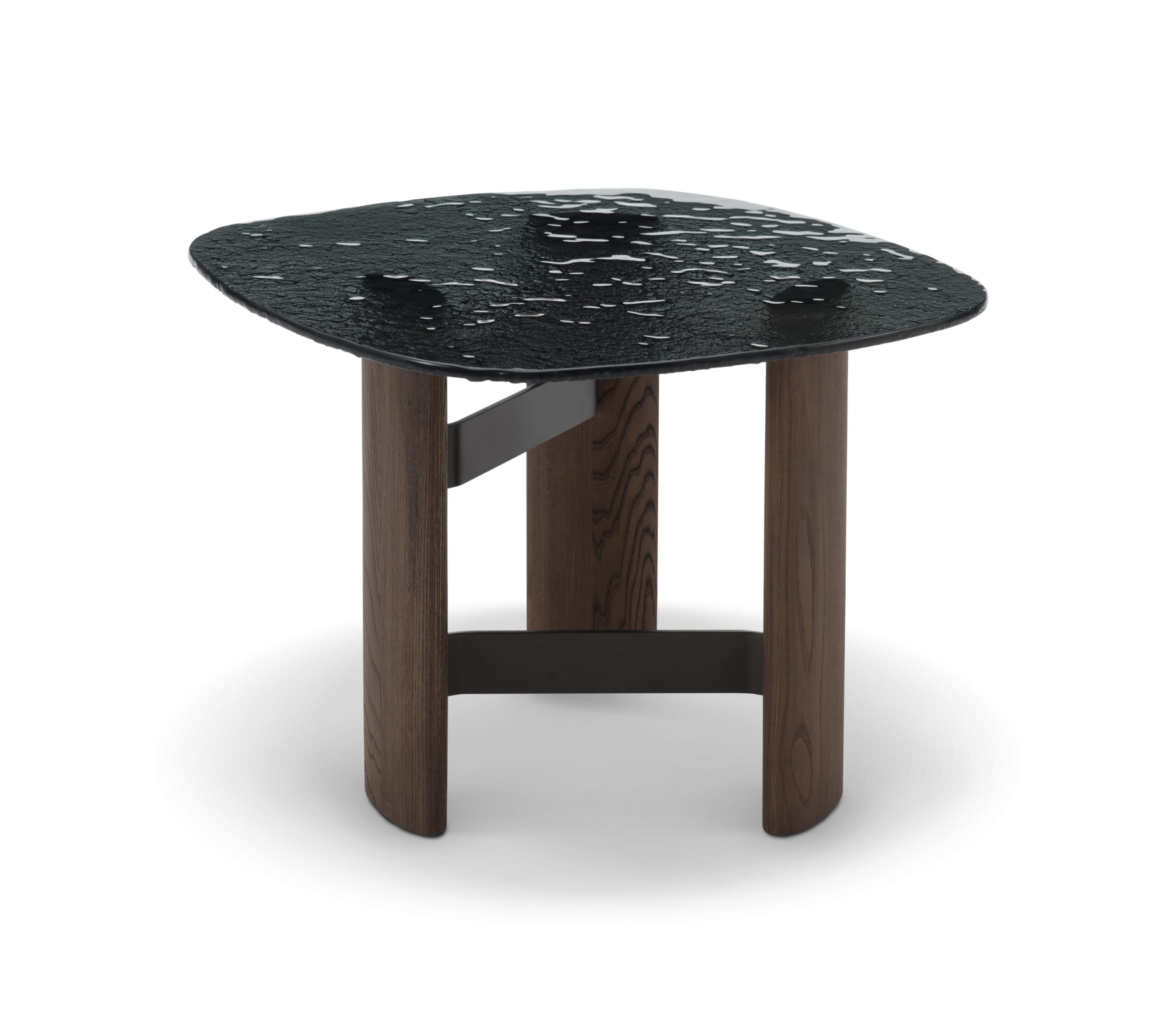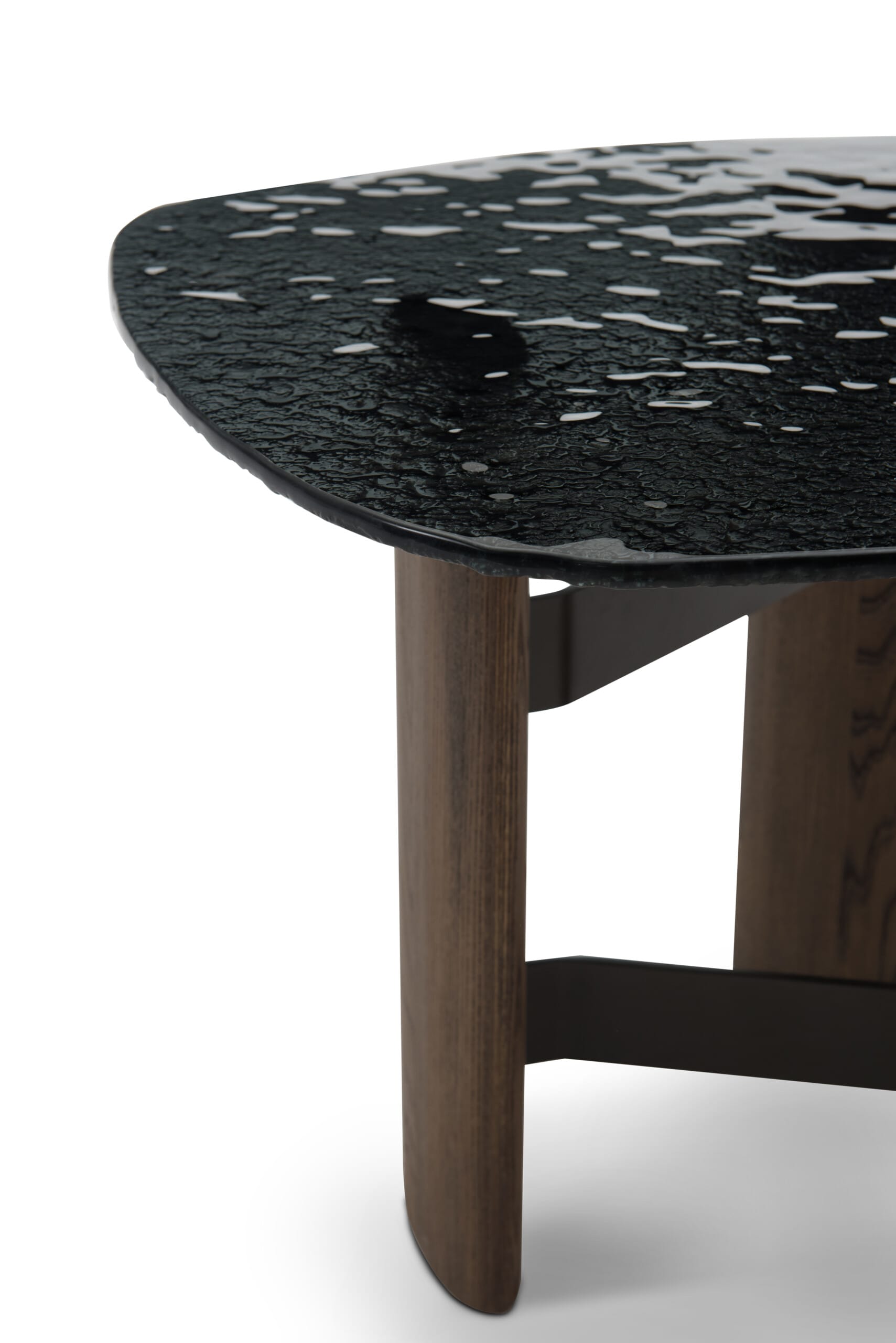 Blatul din sticlă fumurie, cu efect artistic „watery art”, creează un joc subtil de transparențe și reflexii, adăugând profunzime și caracter. Structura din lemn masiv de ulm, finisată într-o nuanță închisă, este completată de elemente metalice cu finisaj negru mat, care leagă armonios componentele și subliniază liniile curate ale designului.
