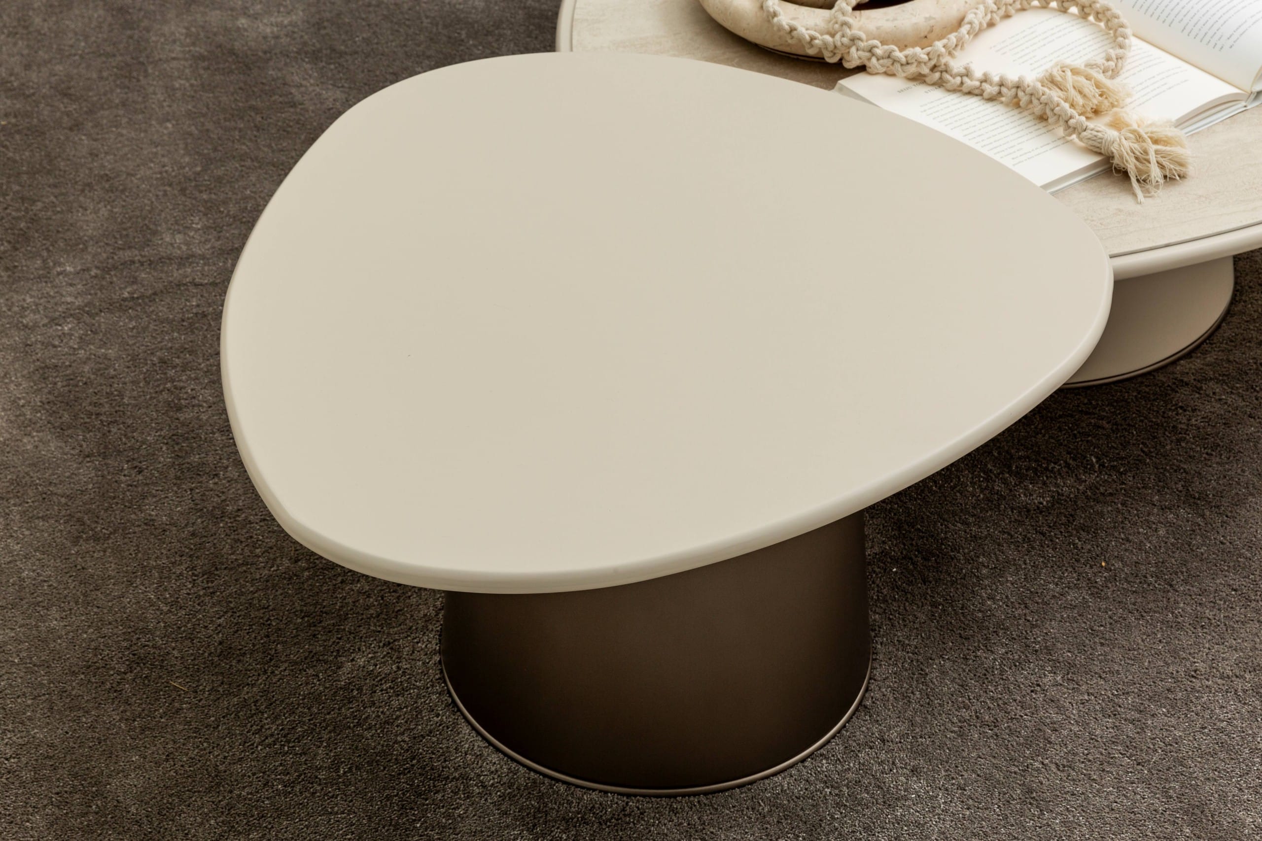 Blatul rotund, cu finisaj uniform și margini fine, se sprijină pe o bază cilindrică metalică, care adaugă un accent discret contemporan. Contrastul dintre suprafața superioară și baza mai subțire creează un obiect echilibrat vizual, ușor de integrat în compoziții moderne, hoteluri boutique sau zone de relaxare sofisticate.
