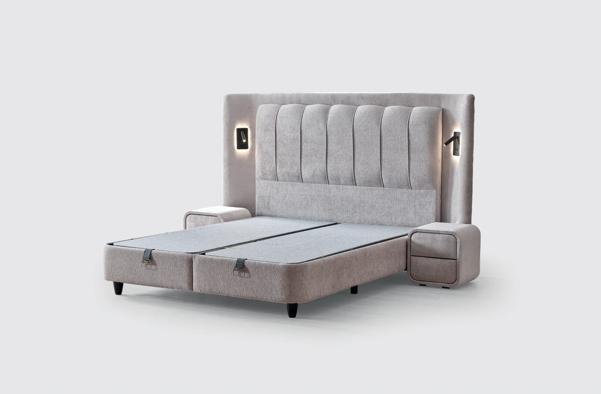 Patul matrimonial Julie îmbină eleganța modernă cu funcționalitatea premium, fiind creat pentru dormitoare sofisticate și perfect organizate. Tăblia înaltă, capitonată vertical, oferă un aspect rafinat și un plus de confort, iar sistemul integrat cu iluminare LED și prize adaugă un nivel superior de utilitate și stil.