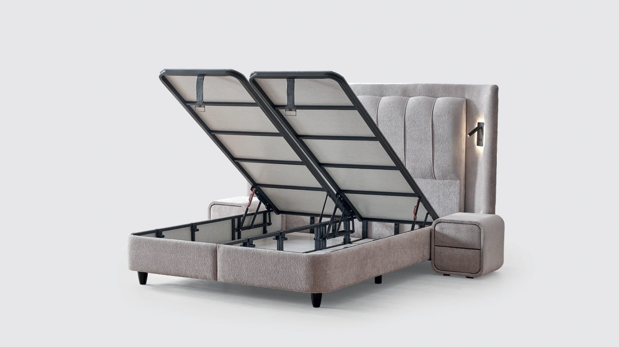 FunctionalitateSpațiu de depozitare generos pentru lenjerii, perne și pături. Iluminare ambientală integrată pentru un plus de eleganță. Conectivitate integrată (prize / USB) pentru un dormitor modern.
