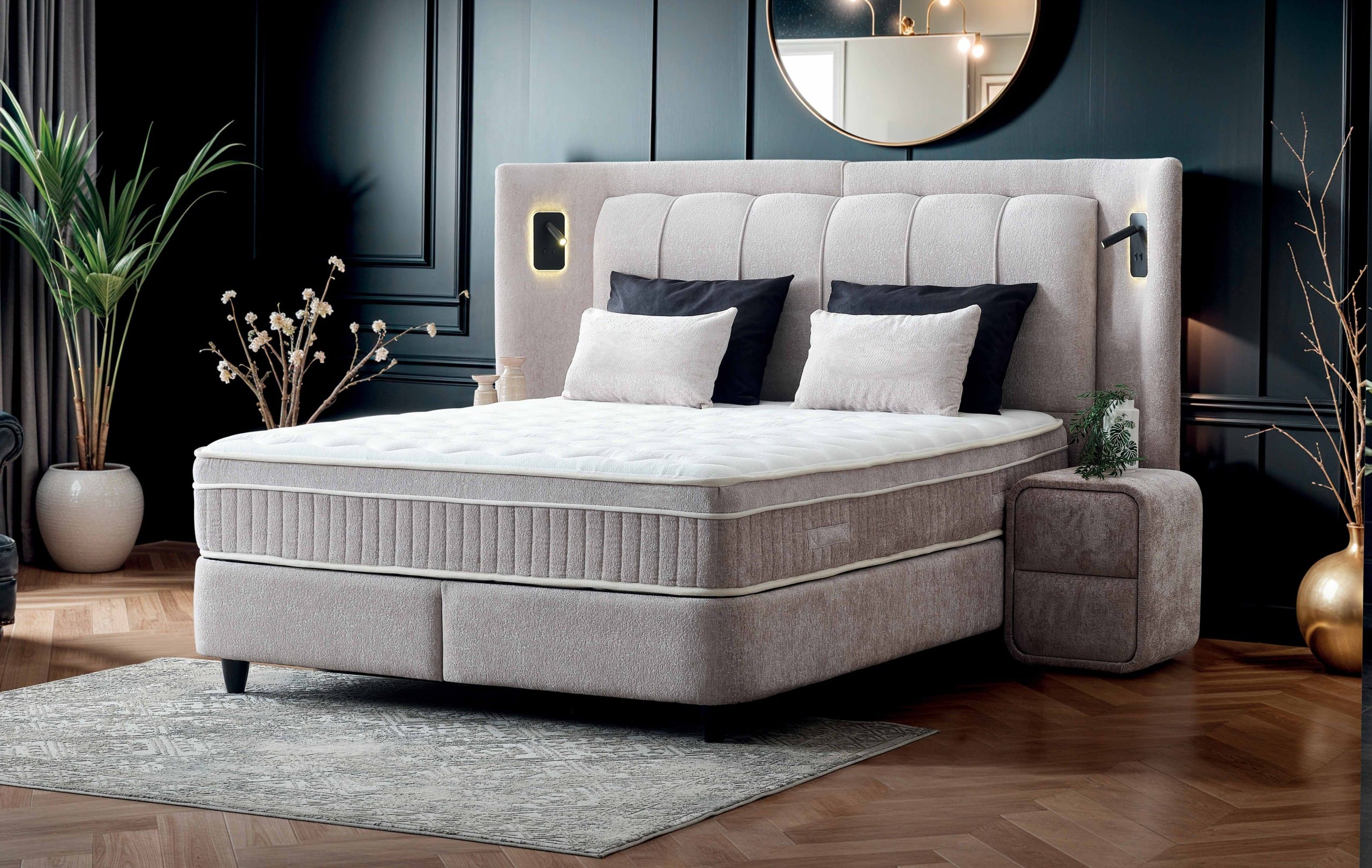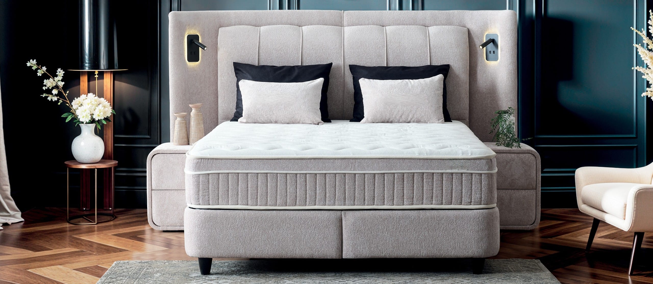 TablieDesign modern, capitonaj vertical elegant. Iluminare LED ambientală integrată + lămpi de citit încorporate. Prize și porturi integrate pentru confort maxim.
