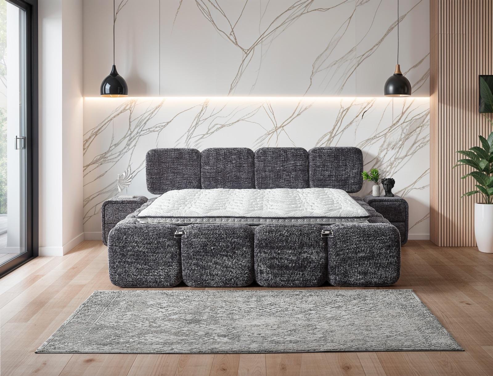 Pat Boxspring MARVEO cu ladǎ de depozitare, structurǎ metalicǎ, saltea premium cu topper integrat, material premium