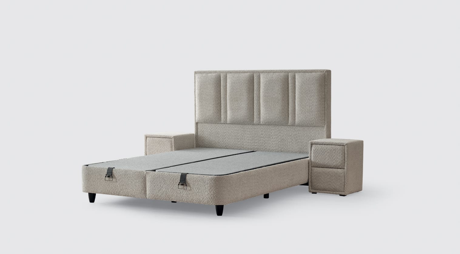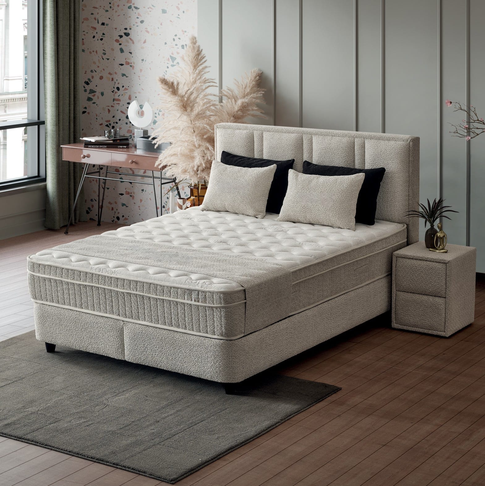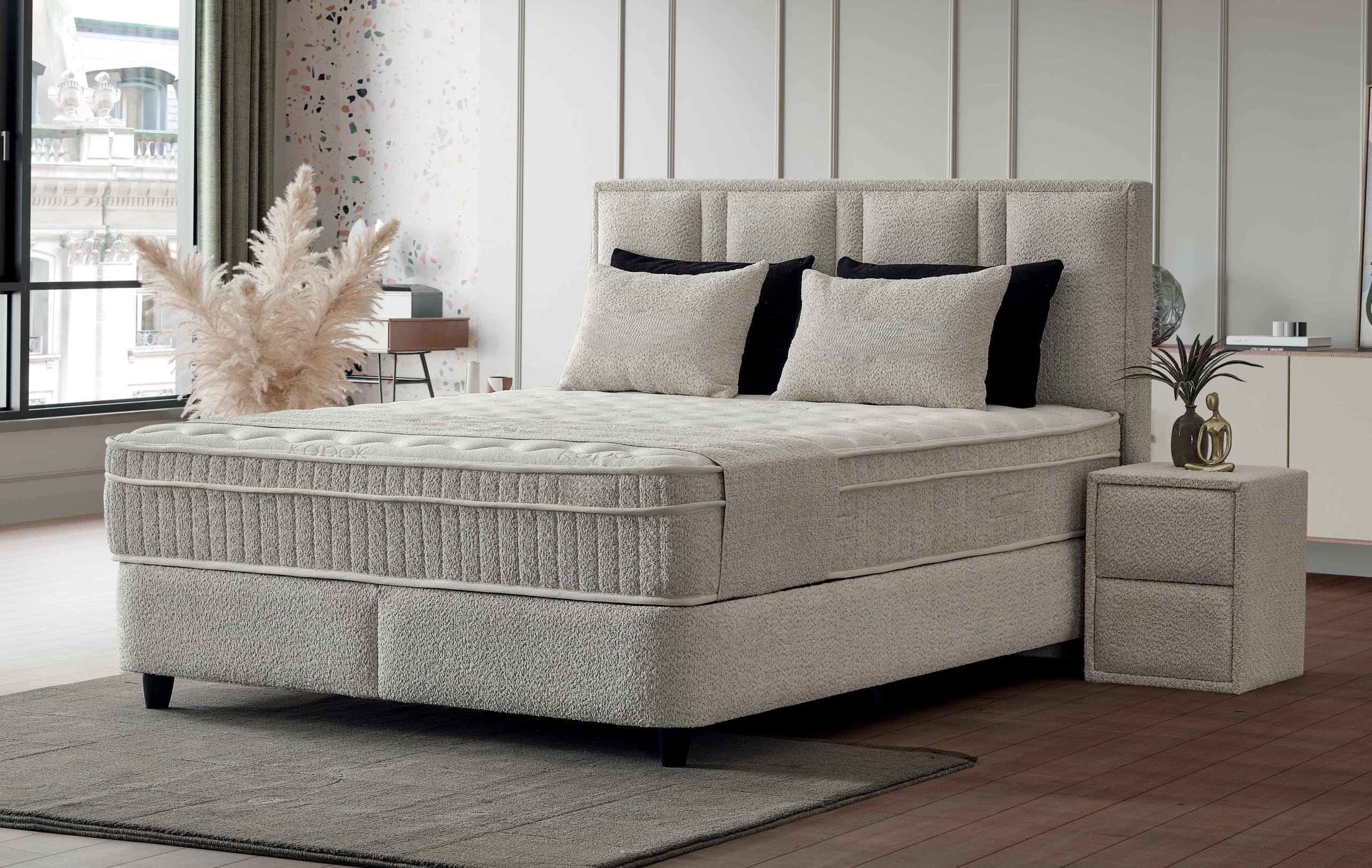 Pat Boxspring PARIS cu ladă de depozitare, structura metalica, material și saltea premium cu topper integrat, design organic