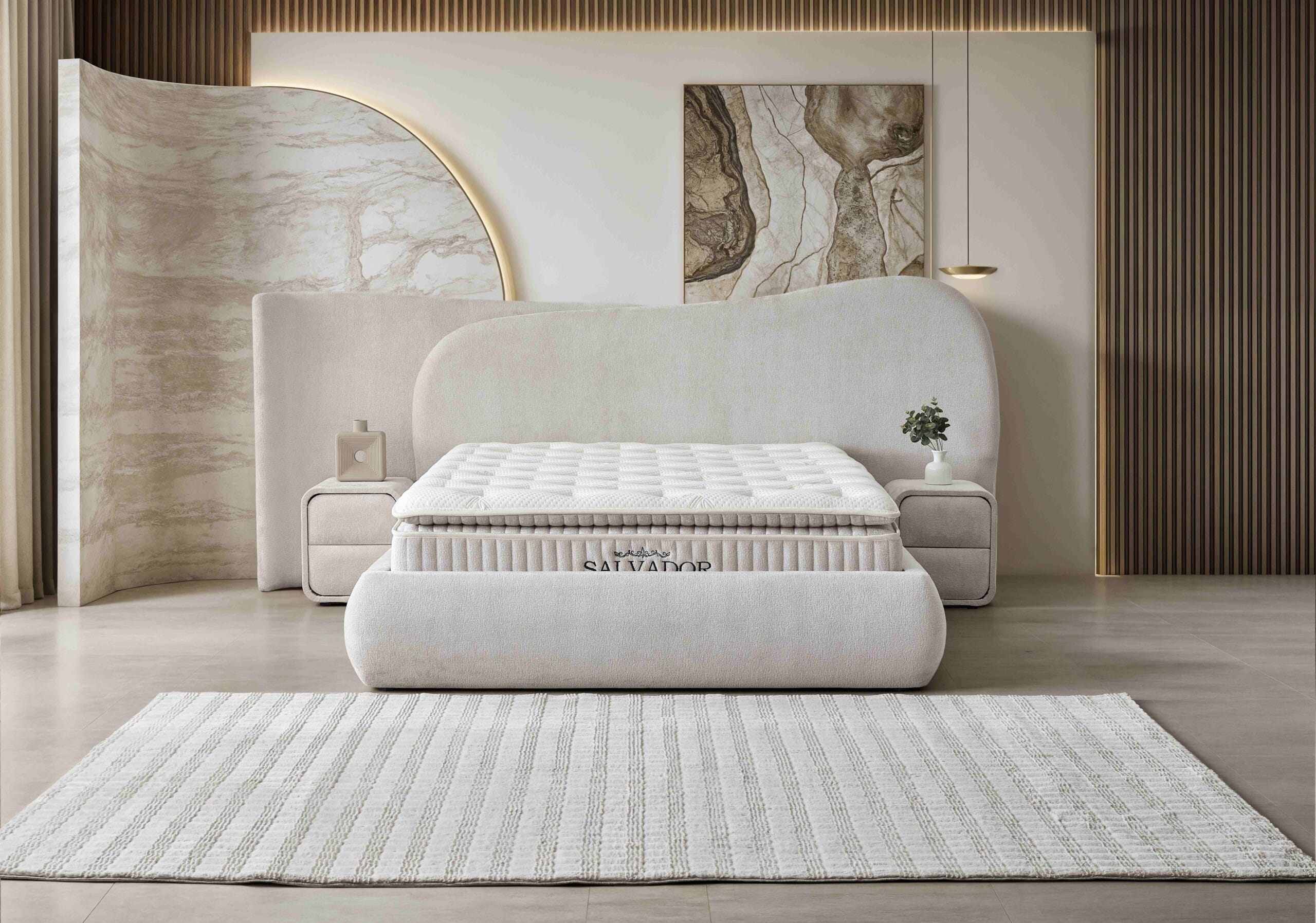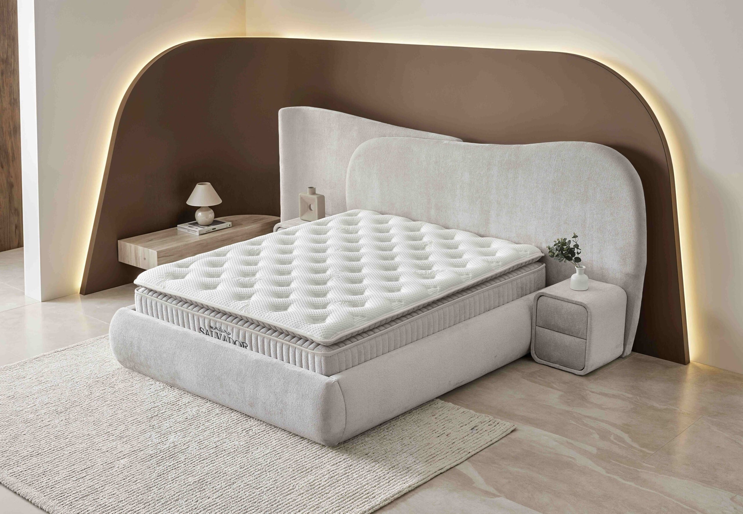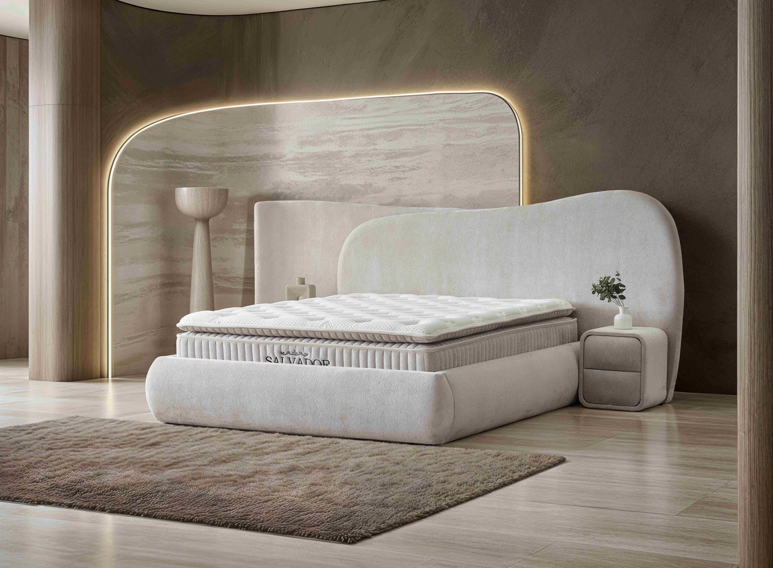 Patul Salvador redefinește estetica dormitorului modern printr-un design fluid, cu forme organice și linii arhitecturale spectaculoase. Tăblia asimetrică, completată de panoul decorativ iluminat ambient, transformă patul într-o piesă statement, cu impact vizual puternic.